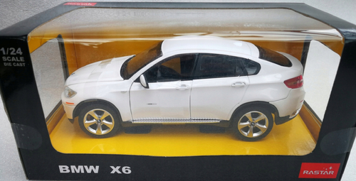 Model samochodu marki BMW X6 w skali 1:24 renomowanej firmy Rastar. Wykonany z odwzorowaniem najdrobniejszych szczegółów. Auto posiada gumowe opony i możliwość otwierania drzwi. Model wyprodukowany na licencji BMW