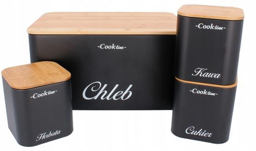 Funkcjonalny zestaw składający się z chlebaka oraz 3 niezależnych pojemników. Pojemnik przeznaczone są do przechowywania kawy, herbaty oraz cukru. Wygodne oraz szczelne pokrywki zabezpieczają produkty przed wysychaniem oraz pleśnią. Bambusowe pokrywki mogą posłużyć również jako deski do krojenia.