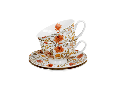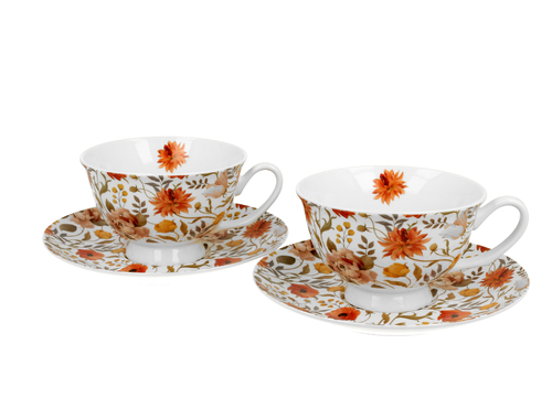 Komplet dwóch filiżanek royal ze spodkami SUMMER FLOWERS wchodząca w skład serii Flowers Exclusive, wykonany z porcelany New Bone China, charakteryzującej się elegancką i naturalną kremowo – białą barwą z delikatnym połyskiem, a także wyjątkową wytrzymałością.
