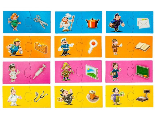 Gra SPINKI zawody to idealna układanka dla każdego przedszkolaka. Świetnie łączy naukę z dobrą zabawą. Poprzez skojarzenia poszczególnych części, maluchy dobierają elementy układanki w całość. Zabawa polega na połączeniu puzzla przedstawiającego zawód z puzzlem , na którym jest przedmiot pasujący do tego zawodu, np. kucharz z garnkiem.