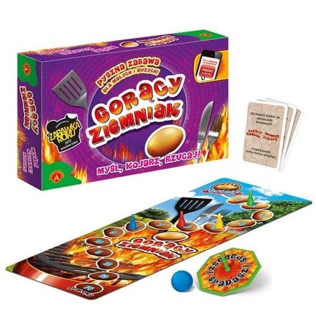 Przezabawna gra rodzinna, sprawdzająca refleks. Myśl, kojarz, rzucaj i pozbądź się Gorącego Ziemniaka zanim się sparzysz! Rozłóż planszę i połóż ją na stole. Grę rozpoczyna najniższy z graczy biorąc kulkowego „ziemniaka” do ręki. Osoba siedząca po jego prawej stronie wyciaga pierwszą kartę z talii i czyta na głos pytanie. Następnie energicznie kręci bączkiem lub uruchamia aplikację do odmierzania czasu dostępną do pobrania na smartfona. Ten, kto trzyma ziemniaka musi udzielić odpowiedzi na zadane pytanie i jak najszybciej przekazać kulkę osobie po naszej lewej stronie (zgodnie z ruchem wskazówek zegara) i ona również musi udzielić odpowiedzi na to samo pytanie. „Ziemniak” tak długo krąży pomiędzy graczami aż bączek odmierzający czas przestanie się kręcić lub aplikacja na telefonie pokaże stop. Wówczas osoba, która w tym momencie miała kulkę w ręce spada o jedno pole na planszy.